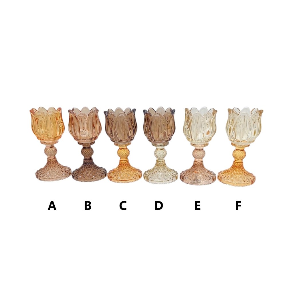 Tento elegantný sklenený svietnik v tvare tulipánu je nádherným doplnkom, ktorý okamžite zaujme svojím luxusným vzhľadom. Je vyrobený z hrubého, kvalitného skla a jeho brúsený vzor pripomína krištáľové sklo, čo mu dodáva sofistikovaný a jemne vintage nádych. Svietnik je zafarbený v odtieňoch hnedej, oranžovej a marhuľovej pričom nožička svietnika má kontrastný tón k držiaku čajovej sviečky, čo vytvára zaujímavý farebný efekt.