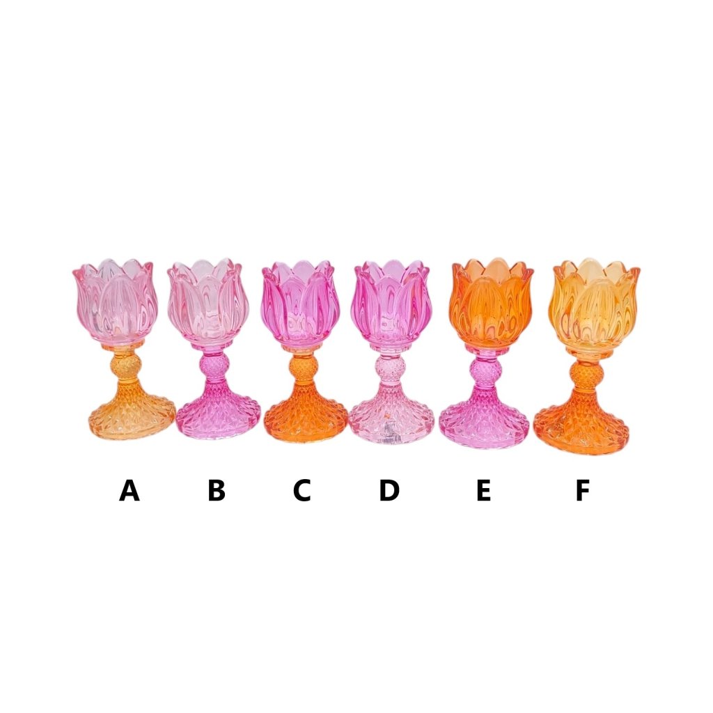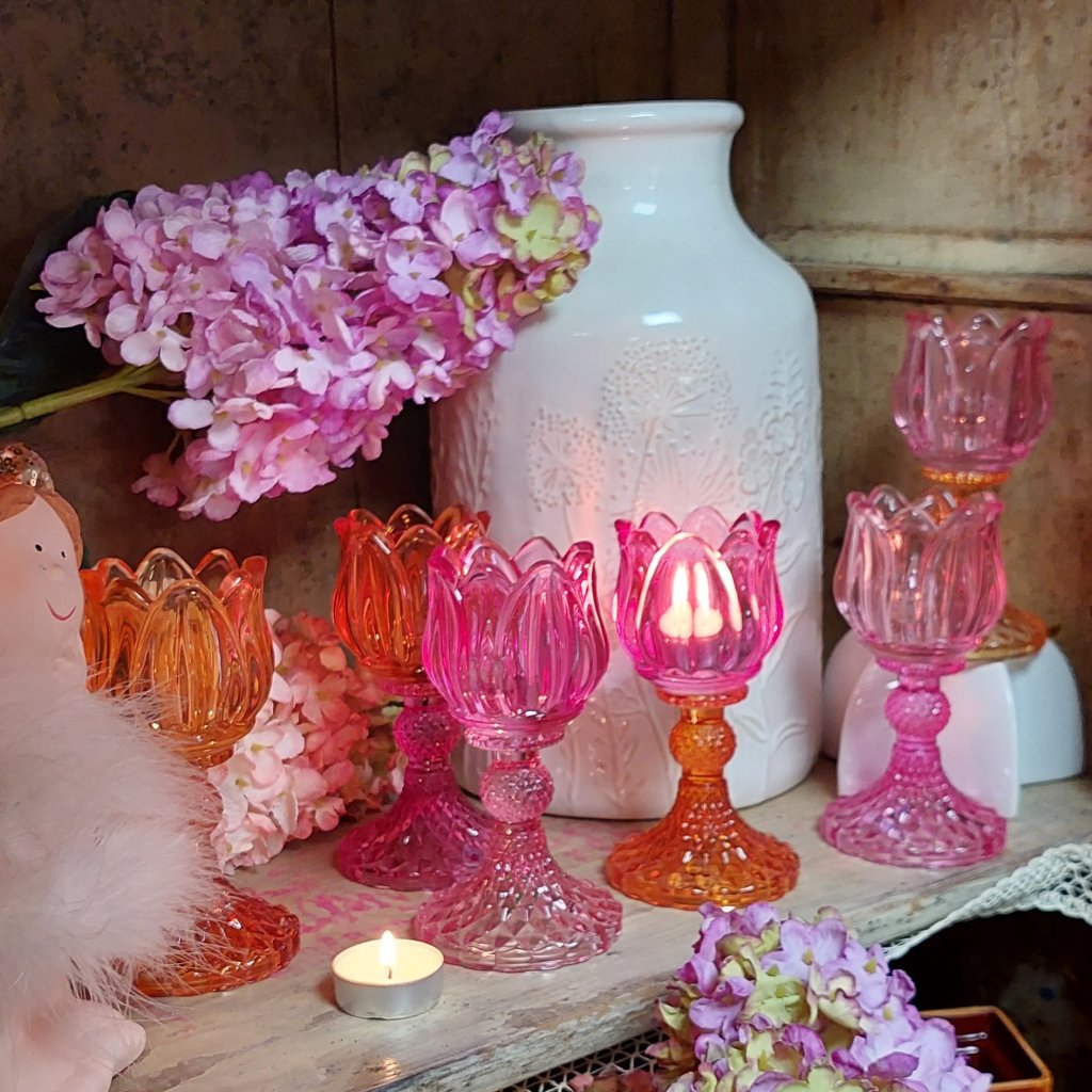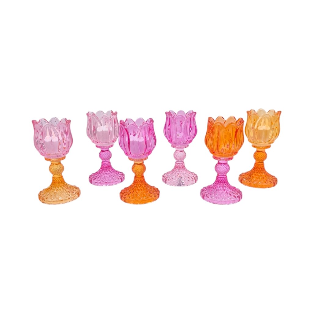 Tento elegantný sklenený svietnik v tvare tulipánu je nádherným doplnkom, ktorý okamžite zaujme svojím luxusným vzhľadom. Je vyrobený z hrubého, kvalitného skla a jeho brúsený vzor pripomína krištáľové sklo, čo mu dodáva sofistikovaný a jemne vintage nádych. Svietnik je zafarbený v odtieňoch ružovej a oranžovej, pričom nožička svietnika má kontrastný tón k držiaku čajovej sviečky, čo vytvára zaujímavý farebný efekt.