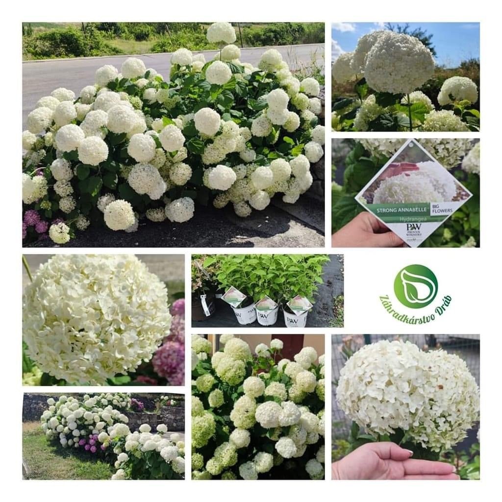 Hydrangea arborescens Strong Anabelle je najvyhľadávanejšia, najkrajšia a samozrejme najpredávanejšie hortenzia v našej ponuke. Mega super duper licencovaná Hortenzia Strong Annabelle je top na radovú výsadbu. Nádherná Hydrangea Strong Annabelle je overená bielokvitnúca hortenzia so silným a pevným rastom a jedinečná svojimi obrovskými bielymi kvetmi. Tento opadavý, vzpriamený, bohato rozkonárený ker kvitne od konca leta do neskorej jesene. V plošnej - radovej výsadbe sa odporúča umiestniť hortenzie od seba aspoň 100 cm, nakoľko ide o pomerne mohutné rastliny. Najvhodnejšie stanovište pre hortenzie je na priamom slnku prípadne v polotieni.