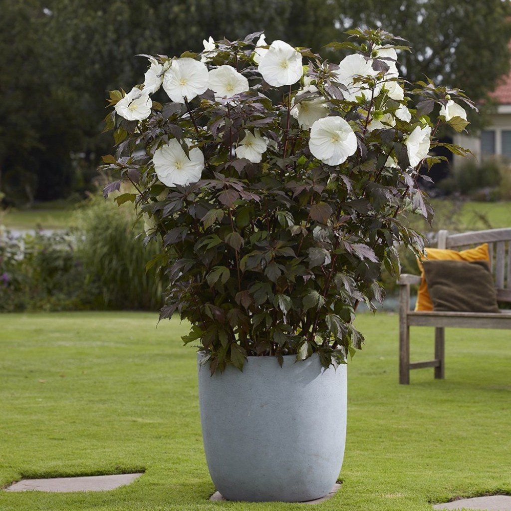 Hibiscus moscheutos ‘Carousel Ghost’ je pôsobivý bahenný ibištek, ktorý zaujme veľkými bielymi kvetmi s jemným ružovým nádychom a kontrastným tmavým stredom. Počas kvitnutia vytvára exoticky pôsobiacu záplavu kvetov, ktoré sa stanú dominantou letného záhona. 🌸