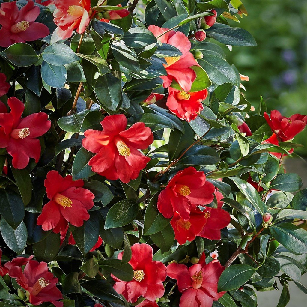 Camellia sasanqua Yuletide, známa ako „vianočná kamélia“, je elegantný vždyzelený ker, ktorý prináša do zimnej záhrady čaro svojimi výraznými, sýtočervenými kvetmi. Tieto jednoduché kvety, zdobené žiarivými zlatými tyčinkami v strede, kvitnú od neskorej jesene až do zimy, čo vytvára nádherný kontrast k tmavozeleným, lesklým listom. Tento ker dodáva zimnej záhrade nielen krásu, ale aj jemnú vôňu.