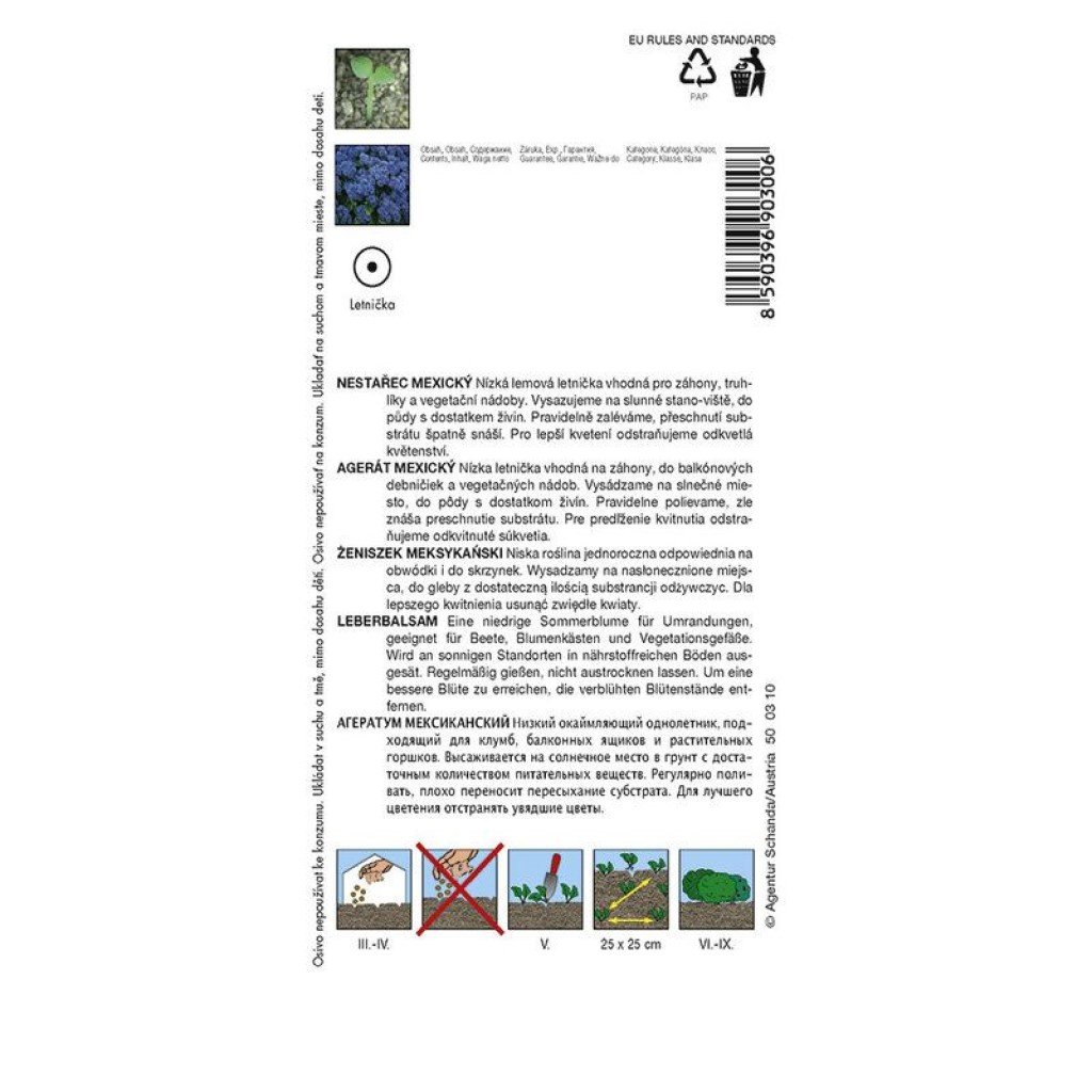 Nestarec mexický - Tetra Blue Mink 0,2 g je fascinujúca letnička, ktorá prinesie na vašu záhradu oslnivú nádheru a jemnosť. Táto unikátna odroda Ageratum mexického je známa svojimi hustými kvetmi v pôsobivej modrej farbe, ktoré pripomínajú jemnosť norkovej srsti. Svojimi bohatými a kompaktnými kvetmi dokáže vytvoriť úchvatné kvety, ktoré sú ideálne pre oživenie záhradných záhonov, kvetinových nádob či okrajov chodníkov.