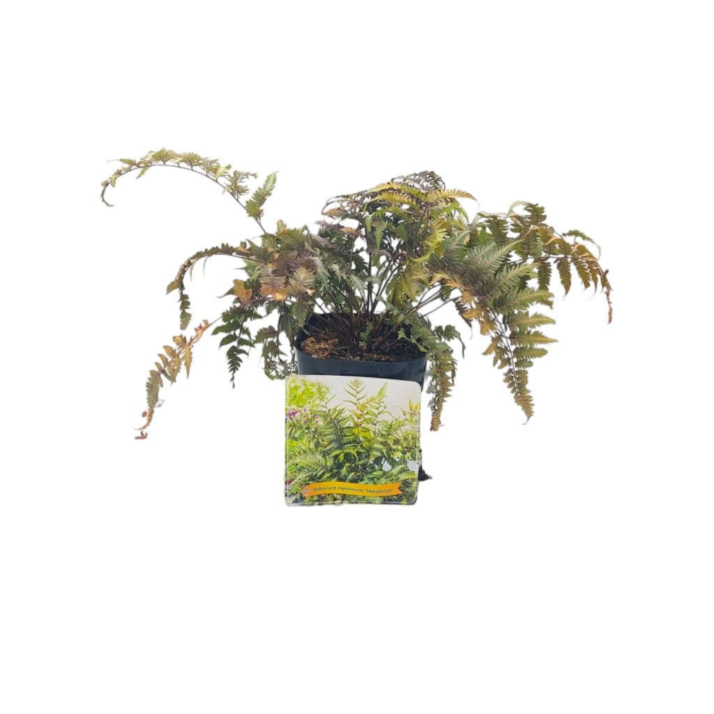 Athyrium niponicum Metallicum je druh paprade, ktorá svojim jemným a sofistikovaným vzhľadom prinesie do vášho domova štipku panenskej, nedotknutej prírody a sviežu atmosféru. Okúzli svojimi nádhernými, kovovo zelenými listami, ktoré sa lesknú ako klenoty na slnečnom svetle. Jeho kompaktný a vzpriamený rast dodá vášmu interiéru/exteriéru štýlový a elegantný vzhľad, čo ho robí dokonalým doplnkom do každého prostredia.