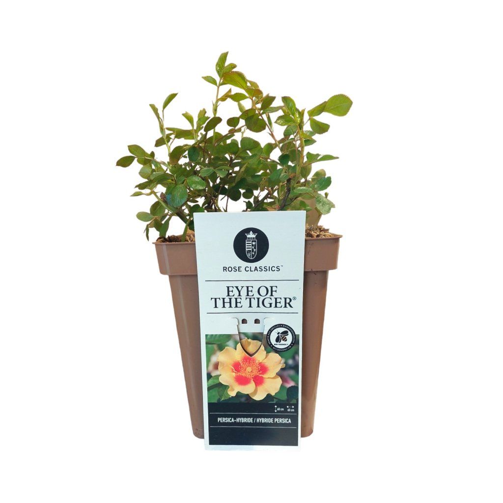 Rosa ‘Eye of the Tiger’ je výrazná a netradičná perzská ruža, ktorá zaujme žlto-oranžovými kvetmi s tmavočerveným až bordovým stredom. Tento kontrastný vzhľad pripomína tigrie oko, vďaka čomu sa stáva neprehliadnuteľným prvkom v každej záhrade. 🌹
