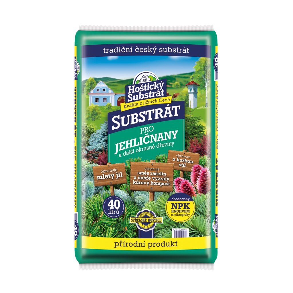 Substrát obsahuje svetlú a tmavú rašelinu, kôrový kompost, ílovu zložku, hnojivo NPK s mikroprvkami, hnojivo síran horečnatý. Substrát je určený na vysádzanie ihličnatých drevín a okrasných kríkov.Zloženie: svetlá a tmavá rašelina, kôrový kompost, ílovou zložku, hnojivo NPK s mikroprvkami, hnojivo síran horečnatý (horkú soľ)Použitie: Po výbere stanovišťa postupujeme vyhĺbením dostatočne veľkej jamy tak, aby jej obvod po stranách bol väčší asi o 10 cm než bal s rastlinou a na dne väčší o 15 až 20 cm. Do jamy nasypeme časť substrátu a vsadíme, miernym odrolením zmenšený bal alebo sadenicu. Voľný priestor vyplníme substrátom, dostatočne utlačíme a zalejeme. Rastliny necháme dobre zakoreniť a po 8 týždňoch (po vyčerpaní zásoby hnojiva v substráte) začneme s pravidelným prihnojovaním napr. Hoštickým hnojivom na ihličnany s guánom, prípadne jeho kvapalnou formou, alebo organicko minerálnym hnojivom Orgamin na konifery. Prihnojenie opakujeme počas vegetačného obdobia 2 až 3 krát. Dodržiavame odporúčaný zálievkový režim.
