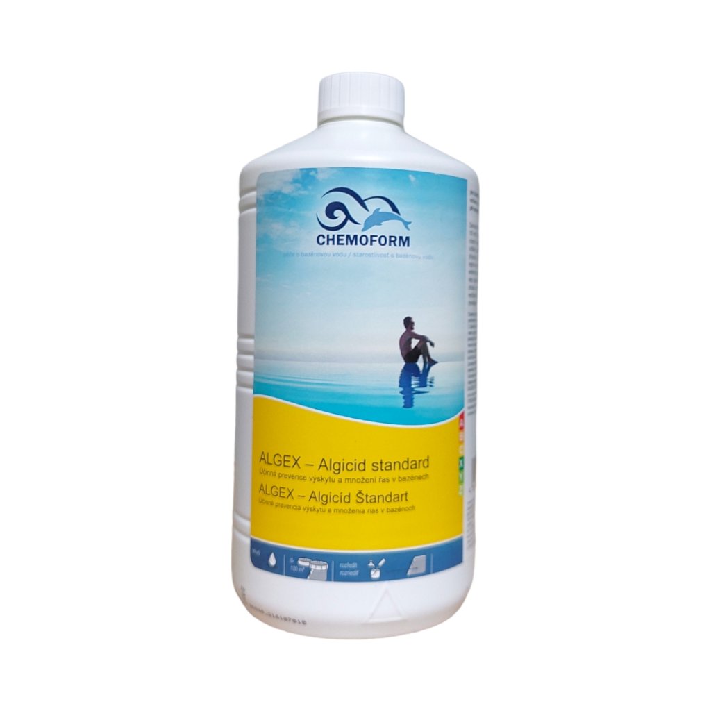 Chemoform Algex je tekutý prípravok proti riasam bez chlóru so zníženou penivosťou, pH neutrálne. Neriedený je bez chuti a zápachu. Dobre sa znáša s inými produktmi starostlivosti o vodu v bazénoch. Pred použitím prípravku upravte pH na predpísané hodnoty. Prvé dávkovanie 100ml na 10m3 bazénovej vody. Priebežné dávkovanie 50ml na 10m3 vody týždenne. Prípravok vždy najprv rozmiešajte s vodou vo vhodnej nádobe a potom opatrne vlievajte podľa stien bazéna. Pri extrémnych podmienkach (vysokej teploty alebo prudký dážď) alebo nadmernom používaní bazéna je nutné dávkovanie zvýšiť!