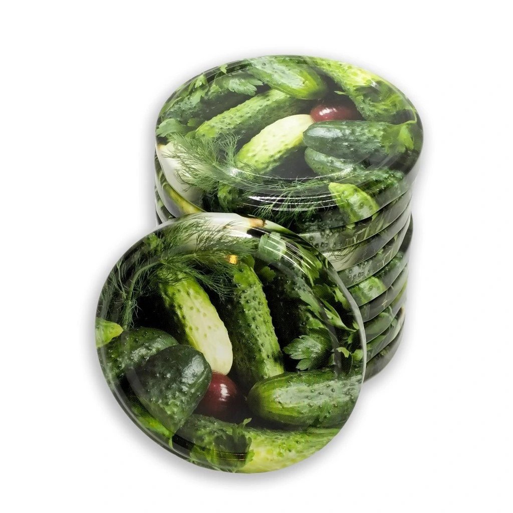 Dekoratívne zaváracie viečka s motívom uhoriek a priemerom 82 mm sú určené na bezpečné uzatváranie veľkých pohárov s tradičnými zaváraninami. Vďaka farebnému dizajnu s realistickým obrázkom nakladaných uhoriek umožňujú rýchlu orientáciu v zásobách v špajze či pivnici. Balenie obsahuje 10 kusov viečok vhodných pre domáce použitie.